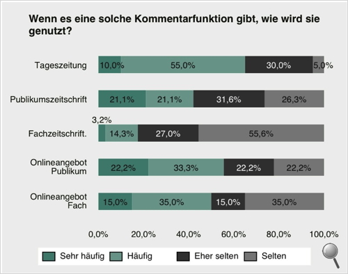 Am aktivsten sind offensichtlich die Leser von Tageszeitungen und Online-Angeboten für das breite Publikum. Nutzer von Fachmedien halten sich dagegen eher zurück.
